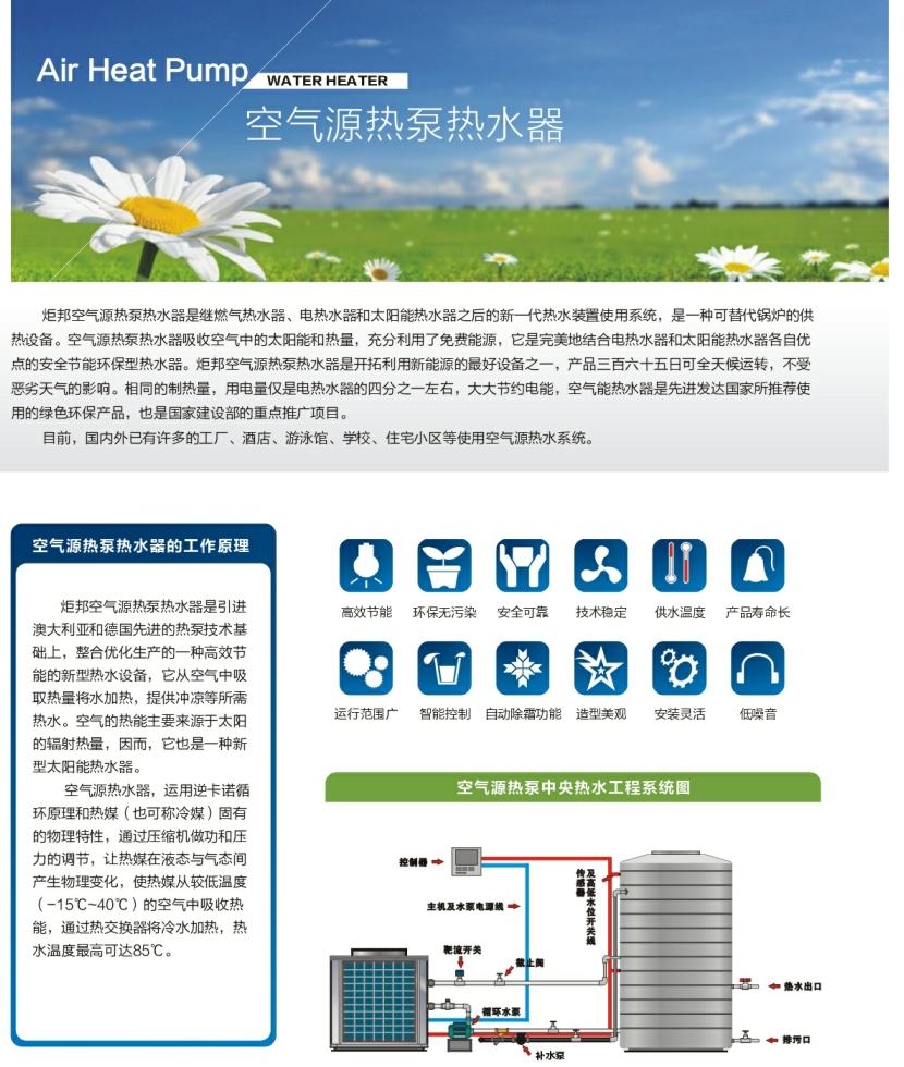 5、循环式空气能热水器的机组与水箱通过管道和水泵循环,让水在系统中循环加热,并储存在保温水箱里,以备各种不同需求时使用,如工厂宿舍、酒店、宾馆、桑拿、沐足、学校浴室等场所。