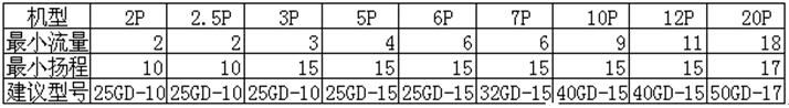 根据安装现场合理的布管,布线,按机组的型号合理地选择电源线,管道和水泵,建议使用管道泵,水泵大小请参考下表: