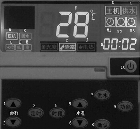 F、28℃正常时显示当前水温,有故障时显示故障代码,设置水温时显示设定温度,并闪动,设置功能时显示功能参数,查询运行参数时显示参数
