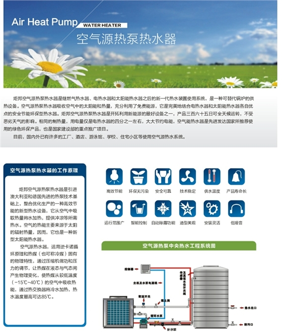 5、直热循环式空气能热水器采用独创的变流量技术,确保热水供应保持恒定水温。自来水经主机一次性可加热到55度,同时机组与水箱通过管道和水泵循环,让水在系统中循环加热,并储存在保温水箱里,以备各种不同需求时使用,如工厂宿舍、酒店、宾馆、桑拿、沐足、学校浴室等场所。